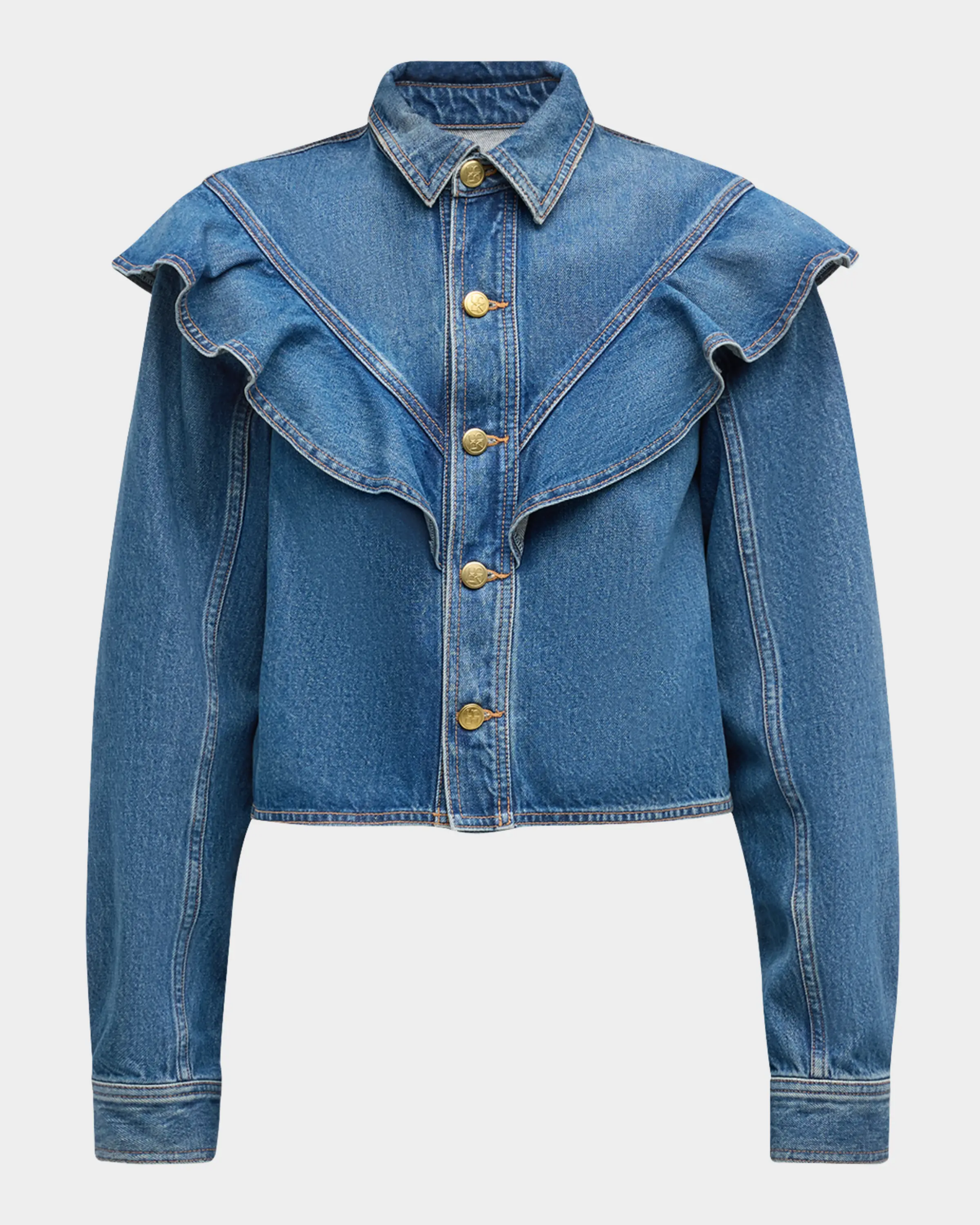 Een statement piece met karakter. Deze denim blouse met ruffle kraag geeft je outfit direct een vrouwelijke, krachtige uitstraling. De stevige denim stof zorgt voor een mooie pasvorm, terwijl de opvallende kraag het geheel nét dat beetje extra geeft. Perfect om casual te dragen, maar ook stijlvol genoeg om je look naar een hoger niveau te tillen.