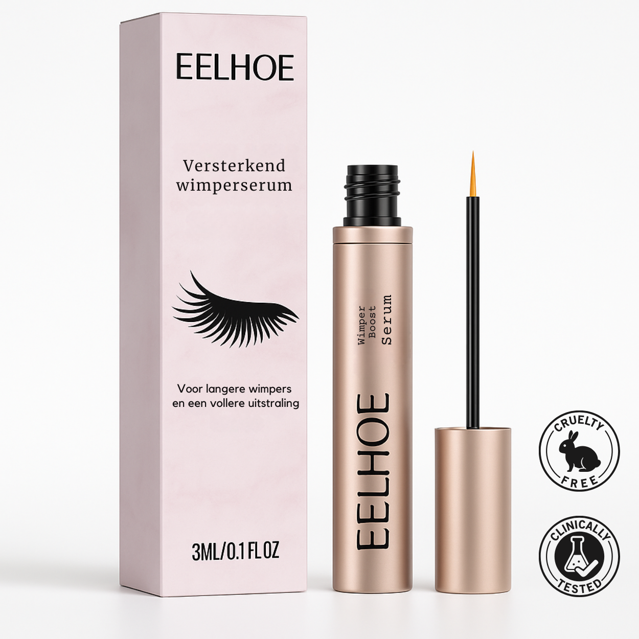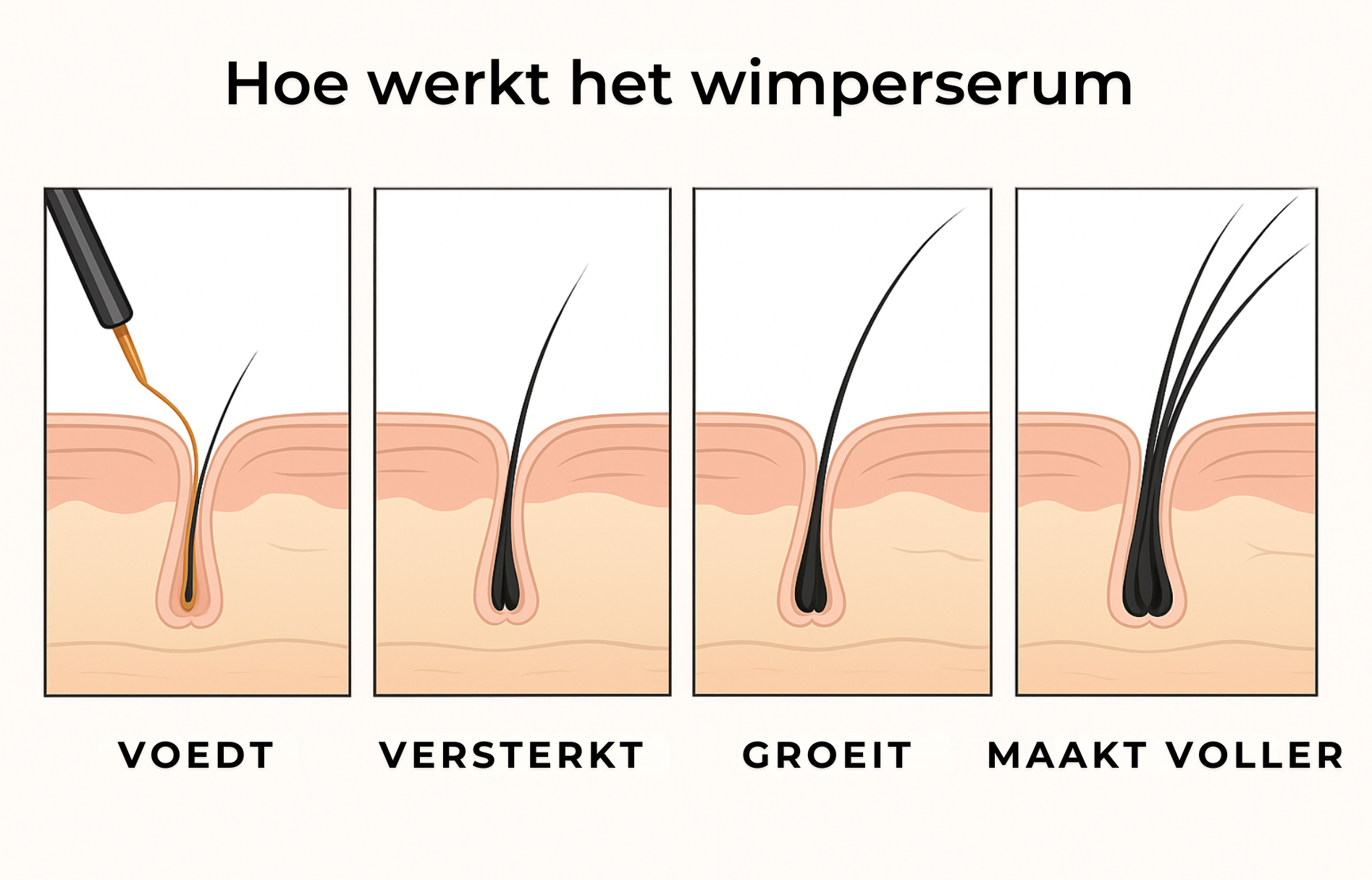 De meeste mensen zien binnen 3–4 weken bij consistent gebruik zichtbare verbeteringen: langere, vollere en sterkere wimpers die zich in de loop van de tijd blijven verbeteren.